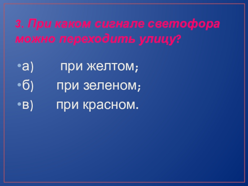 3. При каком сигнале светофора можно переходить улицу? а)       при желтом;б)      при зеленом;в)      при красном.