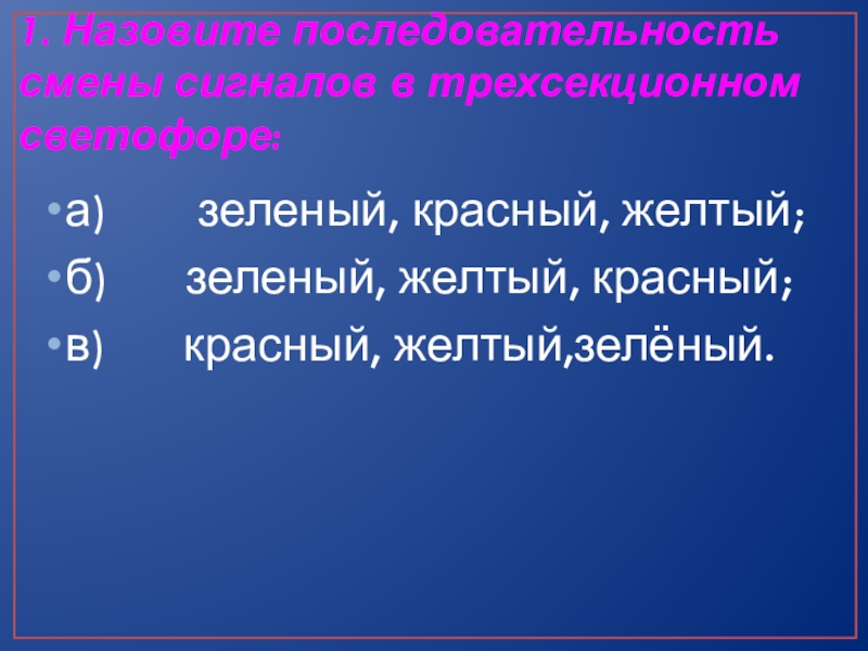 1. Назовите последовательность смены сигналов в трехсекционном светофоре: а)       зеленый, красный, желтый;б)      зеленый, желтый, красный;в)      красный, желтый,зелёный.