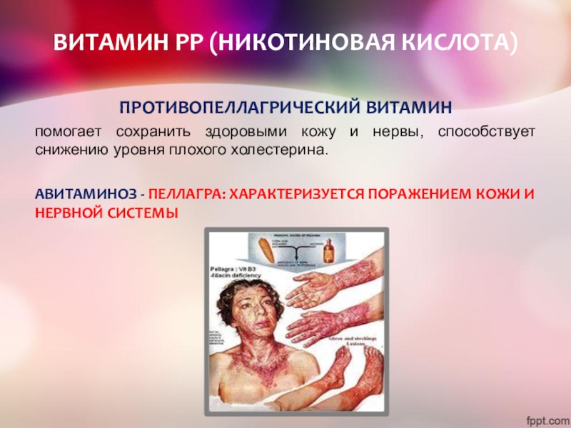 АВИТАМИНОЗ - ПЕЛЛАГРА: ХАРАКТЕРИЗУЕТСЯ ПОРАЖЕНИЕМ КОЖИ И НЕРВНОЙ СИСТЕМЫ