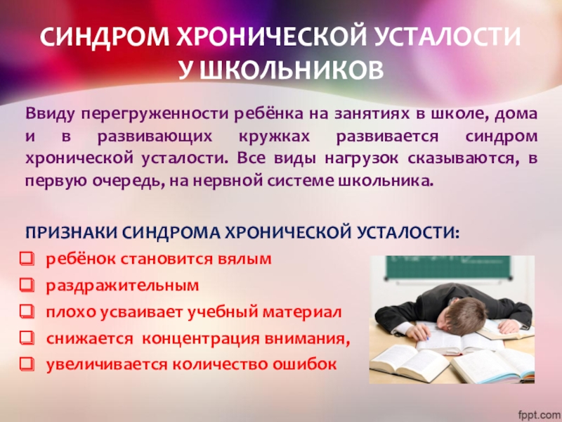 дома и в развивающих кружках развивается синдром хронической усталости. Все виды нагрузок сказываются, в первую очередь, на нервной системе школьника.