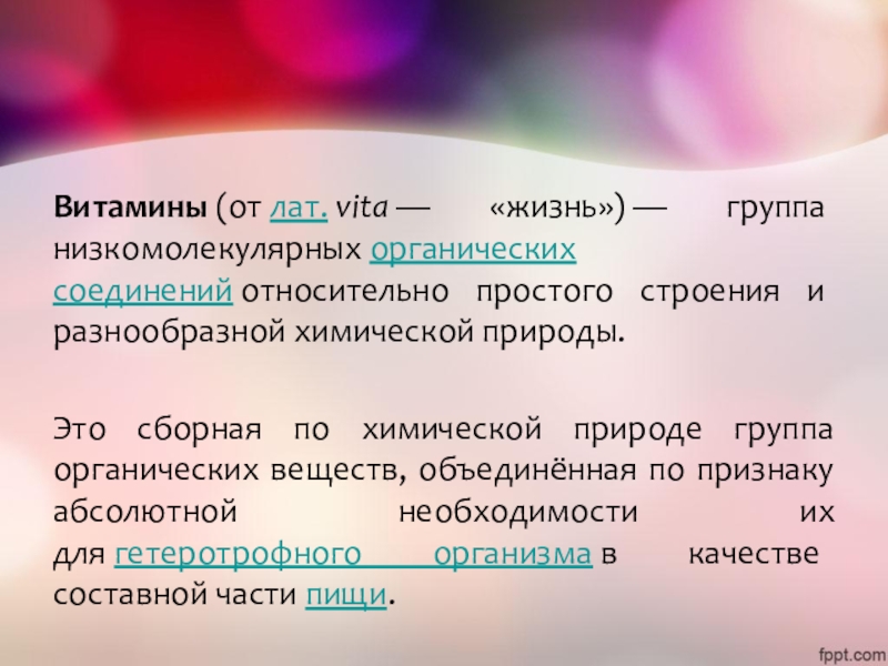 Слайд 2Витамины (от лат. vita — «жизнь») — группа низкомолекулярных органических соединений относительно простого строения и разнообразной химической природы.