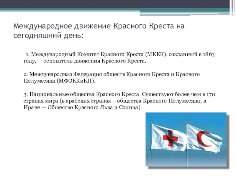 (МККК), созданный в 1863 году, — основатель движения Красного Креста. 2. Международная Федерация обществ Красного Креста и Красного Полумесяца (МФОККиКП). 3. Национальные общества Красного Креста. Существуют более чем в 170 странах мира (в арабских странах— общества Красного Полумесяца, в Иране — Общество Красного Льва и Солнца).