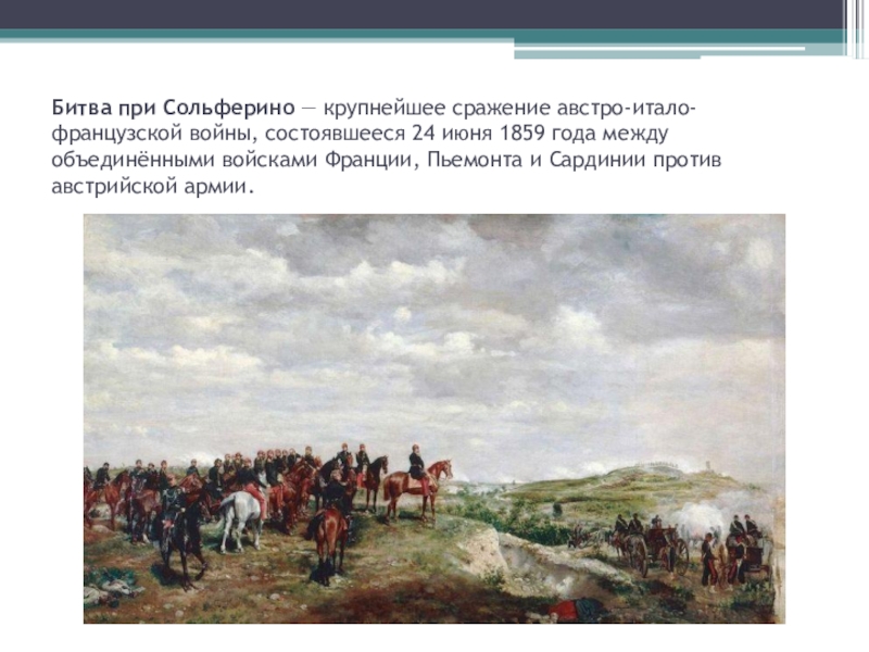 Слайд 4Битва при Сольферино — крупнейшее сражение австро-итало-французской войны, состоявшееся 24 июня