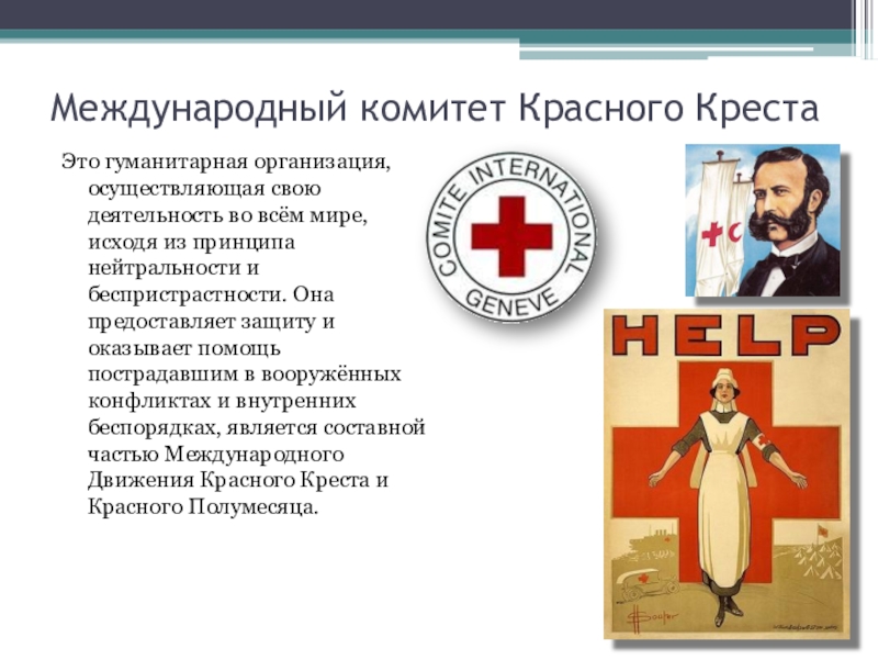 Международный комитет Красного КрестаЭто гуманитарная организация, осуществляющая свою деятельность во всём мире, исходя из принципа нейтральности и