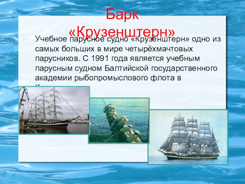 четырёхмачтовых парусников. С 1991 года является учебным парусным судном Балтийской государственного академии рыбопромыслового флота в Калининграде.