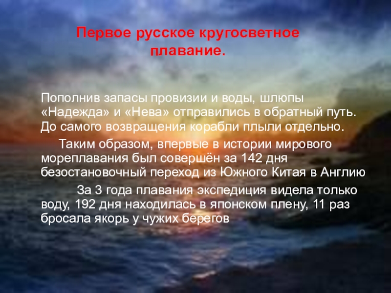 Слайд 13Пополнив запасы провизии и воды, шлюпы «Надежда» и «Нева» отправились в