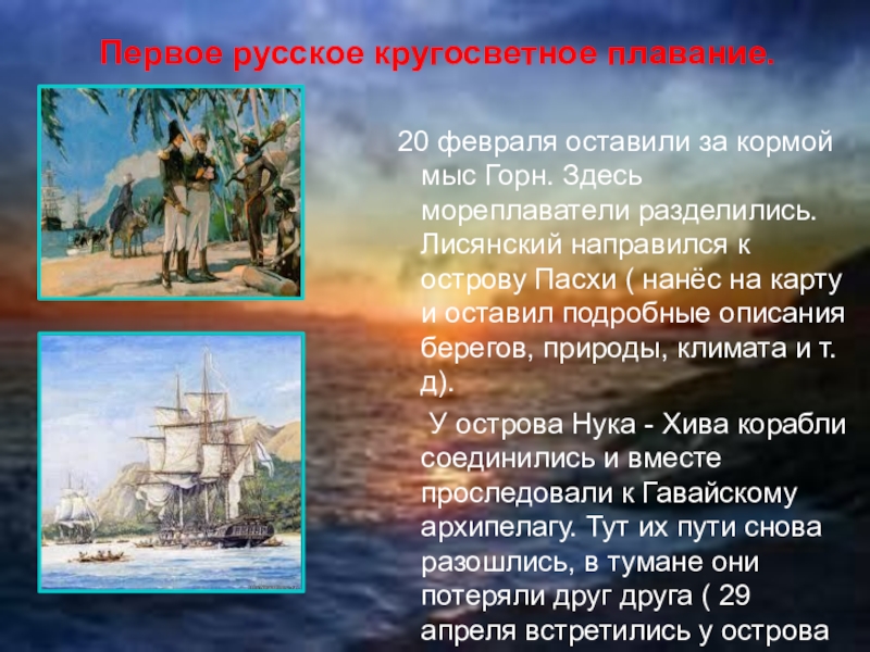 Слайд 11 20 февраля оставили за кормой мыс Горн. Здесь мореплаватели разделились.