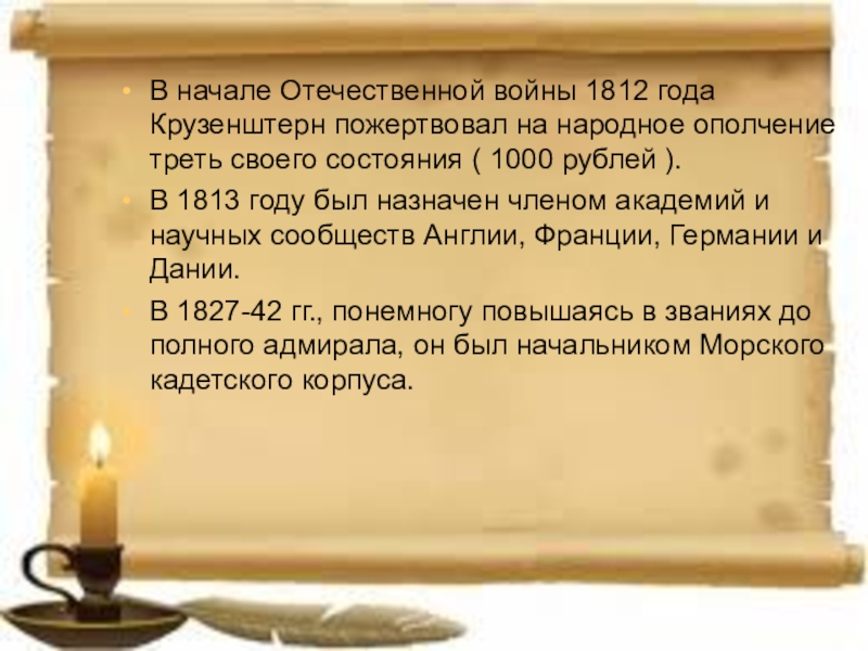 Слайд 18В начале Отечественной войны 1812 года Крузенштерн пожертвовал на народное ополчение