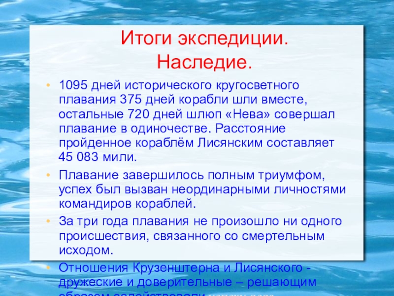 Отношения Крузенштерна и Лисянского - дружеские и доверительные – решающим образом содействовали успеху дела.