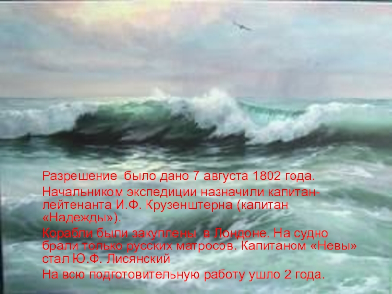 Корабли были закуплены в Лондоне. На судно брали только русских матросов. Капитаном «Невы» стал Ю.Ф. Лисянский