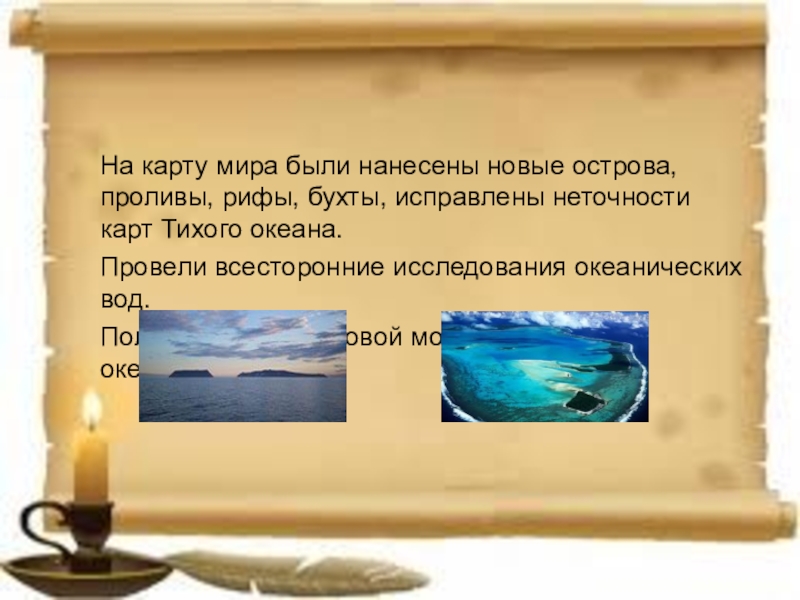 Слайд 17На карту мира были нанесены новые острова, проливы, рифы, бухты, исправлены