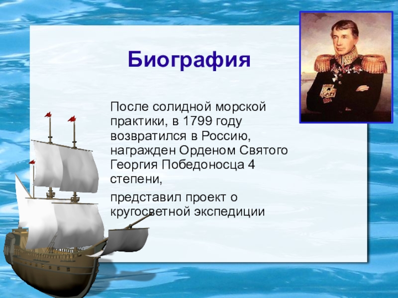 Слайд 4После солидной морской практики, в 1799 году возвратился в Россию, награжден