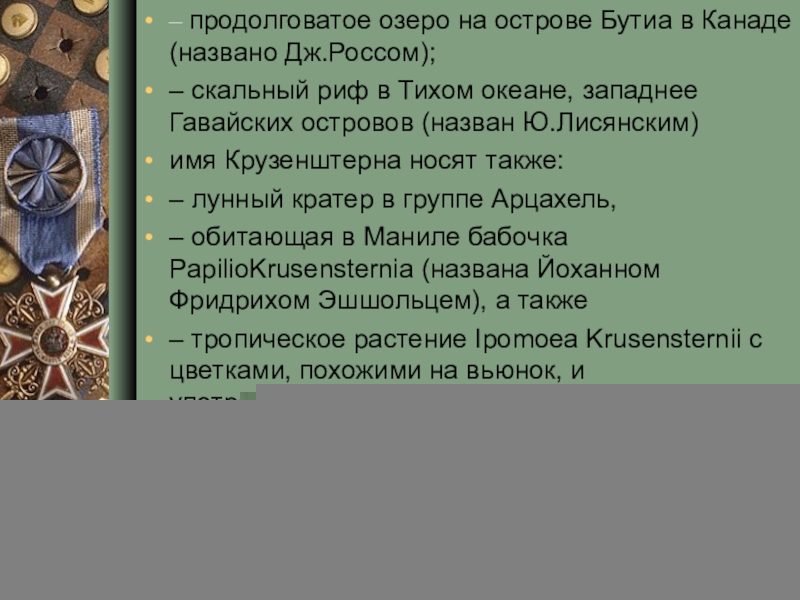 – обитающая в Маниле бабочка PapilioKrusensternia (названа Йоханном Фридрихом Эшшольцем), а также