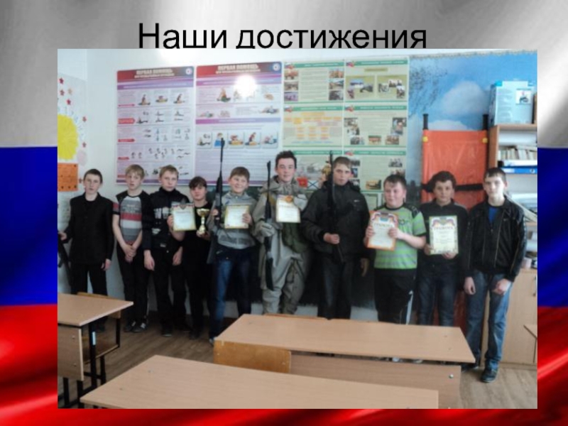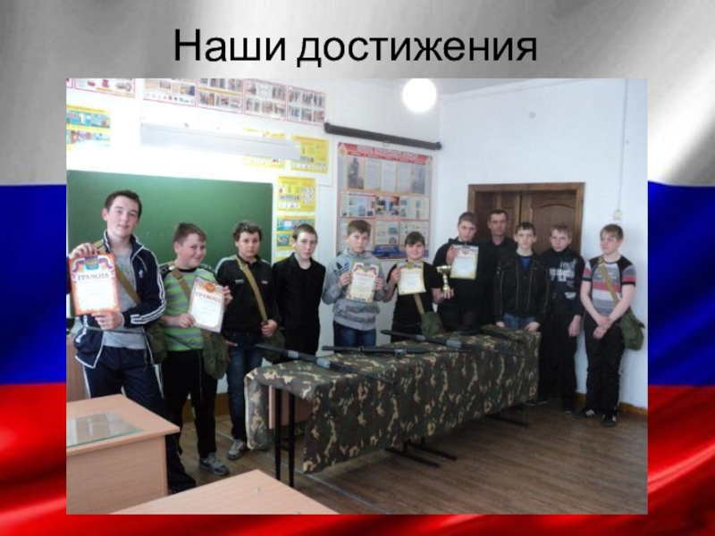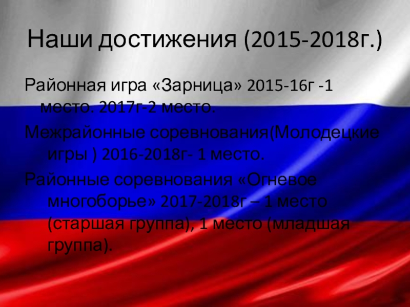 Наши достижения (2015-2018г.)Районная игра «Зарница» 2015-16г -1место. 2017г-2 место.Межрайонные соревнования(Молодецкие игры ) 2016-2018г- 1 место.Районные соревнования «Огневое