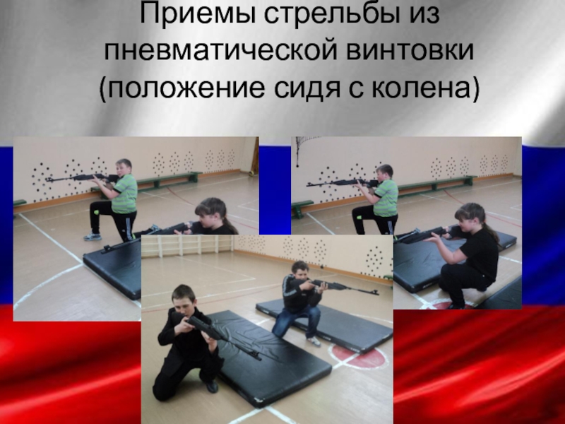Слайд 10Приемы стрельбы из пневматической винтовки (положение сидя с колена)