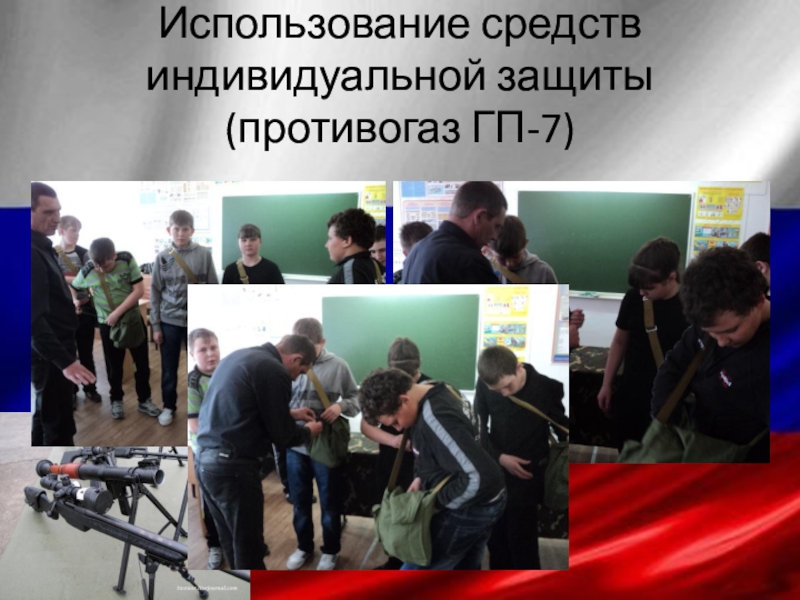 Слайд 5Использование средств индивидуальной защиты (противогаз ГП-7)