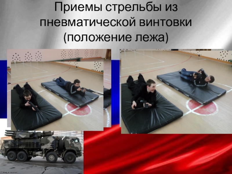 Слайд 8Приемы стрельбы из пневматической винтовки (положение лежа)