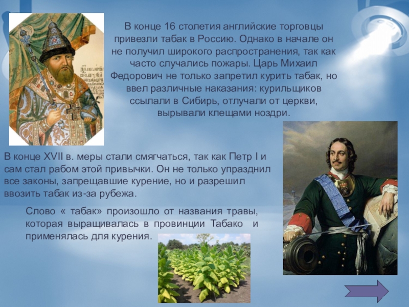 В конце XVII в. меры стали смягчаться, так как Петр I и сам стал рабом этой привычки. Он не только упразднил все законы, запрещавшие курение, но и разрешил ввозить табак из-за рубежа.