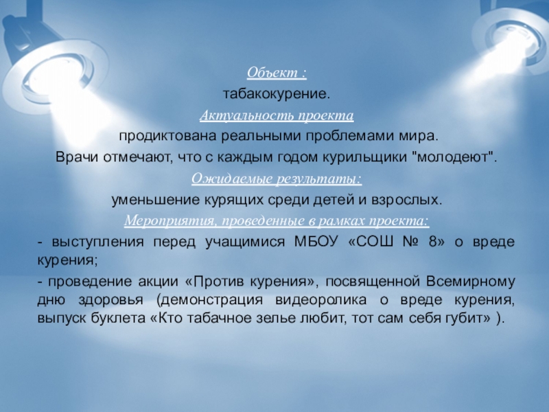 Это сайт презентаций, где можно хранить и обмениваться своими презентациями, докладами, проектами, шаблонами в формате PowerPoint с другими пользователями. Мы помогаем школьникам, студентам, учителям, преподавателям хранить и обмениваться учебными материалами.