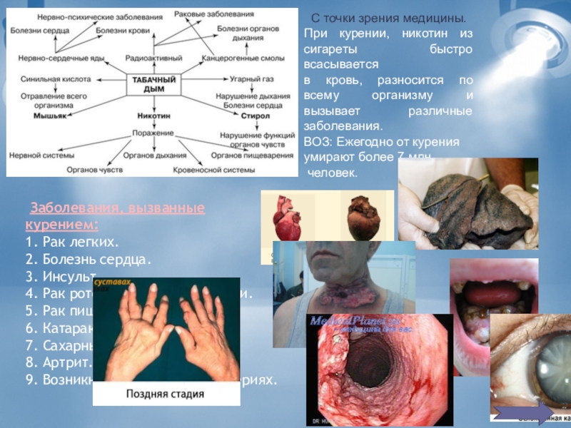 От табачных ядов и никотина страдают все человеческие органы и системы: мозг, легкие, сердце, печень, почки, сосуды, желудок, нервы, глаза и так далее. Курение значительно повышает риск онкологических заболеваний, особенно рака легких и ротовой полости.