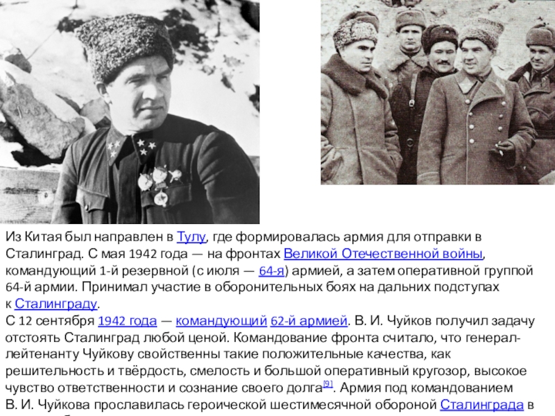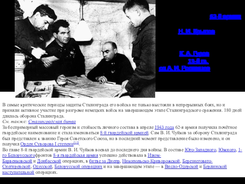 Командный пункт 62-й армии: начальник штаба армии Н. И. Крылов, командующий армией В. И. Чуйков, член Военного совета К. А. Гуров, командир 13-й гв. сд А. И. Родимцев,