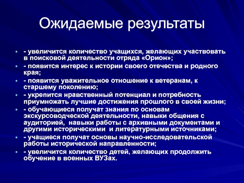 - увеличится количество учащихся, желающих участвовать в поисковой деятельности отряда