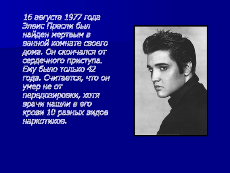 Слайд 30 16 августа 1977 года Элвис Пресли был найден мертвым