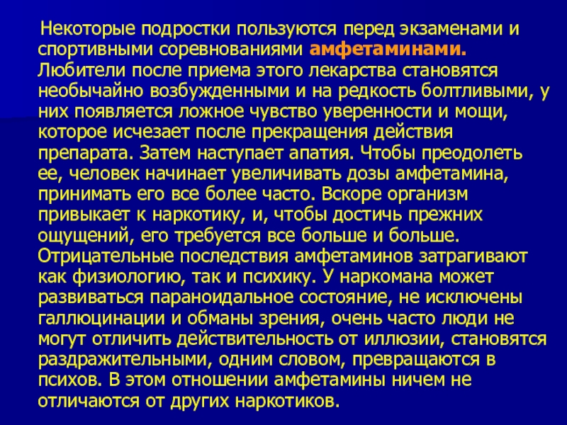 Слайд 10 Некоторые подростки пользуются перед экзаменами и спортивными соревнованиями амфетаминами.