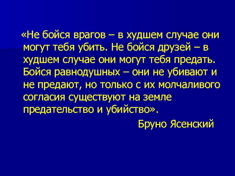 убить. Не бойся друзей – в худшем случае они могут тебя предать. Бойся равнодушных – они не убивают и не предают, но только с их молчаливого согласия существуют на земле предательство и убийство».