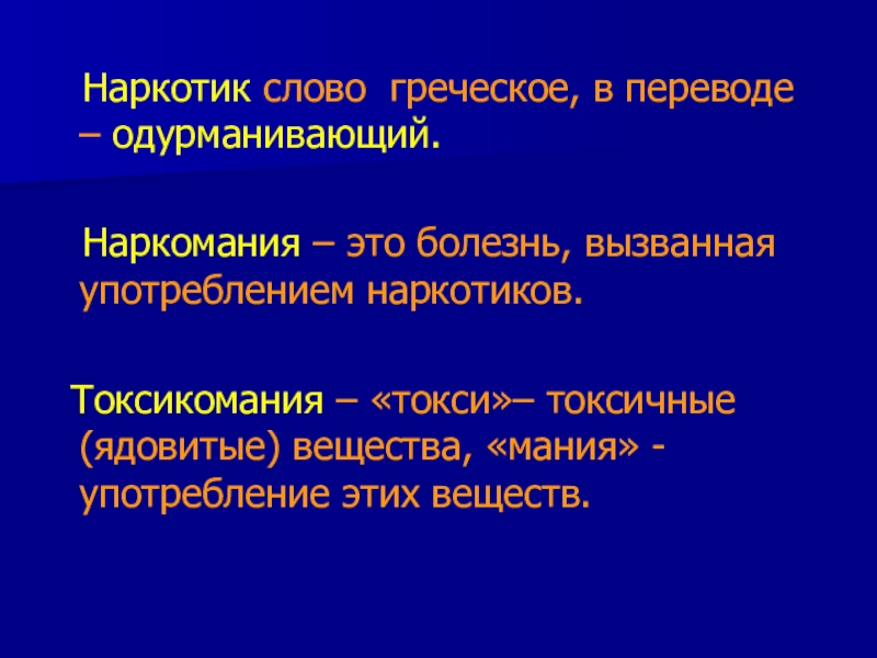Токсикомания – «токси»– токсичные (ядовитые) вещества, «мания» - употребление этих веществ.