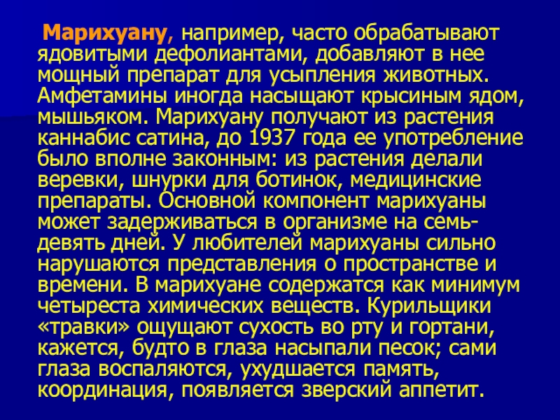 мощный препарат для усыпления животных. Амфетамины иногда насыщают крысиным ядом, мышьяком. Марихуану получают из растения каннабис сатина, до 1937 года ее употребление было вполне законным: из растения делали веревки, шнурки для ботинок, медицинские препараты. Основной компонент марихуаны может задерживаться в организме на семь-девять дней. У любителей марихуаны сильно нарушаются представления о пространстве и времени. В марихуане содержатся как минимум четыреста химических веществ. Курильщики «травки» ощущают сухость во рту и гортани, кажется, будто в глаза насыпали песок; сами глаза воспаляются, ухудшается память, координация, появляется зверский аппетит.