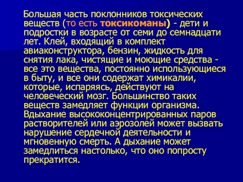 Слайд 13 Большая часть поклонников токсических веществ (то есть токсикоманы) -