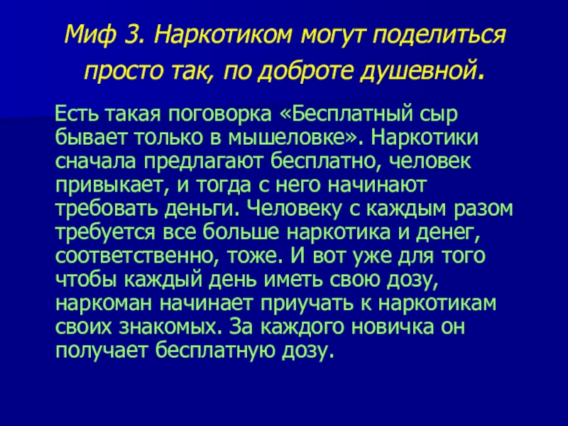 Слайд 37Миф 3. Наркотиком могут поделиться просто так, по доброте душевной.