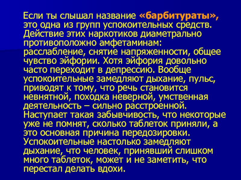 успокоительных средств. Действие этих наркотиков диаметрально противоположно амфетаминам: расслабление, снятие напряженности, общее чувство эйфории. Хотя эйфория довольно часто переходит в депрессию. Вообще успокоительные замедляют дыхание, пульс, приводят к тому, что речь становится невнятной, походка неверной, умственная деятельность – сильно расстроенной. Наступает такая забывчивость, что некоторые уже не помнят, сколько таблеток приняли, а это основная причина передозировки. Успокоительные настолько замедляют дыхание, что человек, принявший слишком много таблеток, может и не заметить, что перестал делать вдохи.