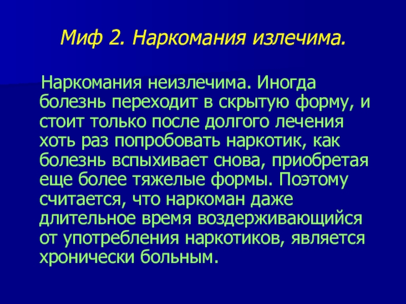 скрытую форму, и стоит только после долгого лечения хоть раз попробовать наркотик, как болезнь вспыхивает снова, приобретая еще более тяжелые формы. Поэтому считается, что наркоман даже длительное время воздерживающийся от употребления наркотиков, является хронически больным.