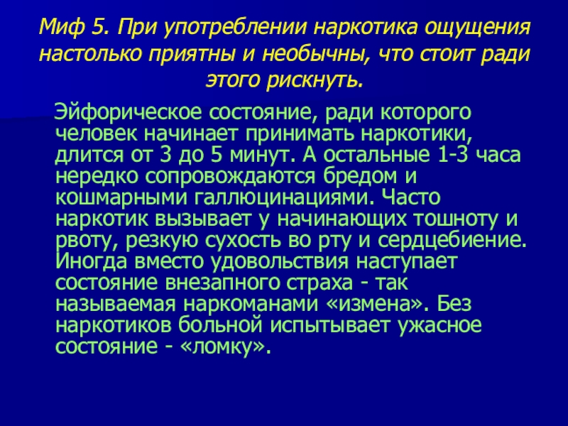 Слайд 39Миф 5. При употреблении наркотика ощущения настолько приятны и необычны, что