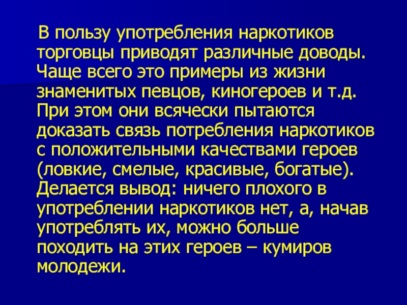 Слайд 20 В пользу употребления наркотиков торговцы приводят различные доводы. Чаще