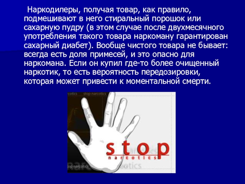 Слайд 21 Наркодилеры, получая товар, как правило, подмешивают в него