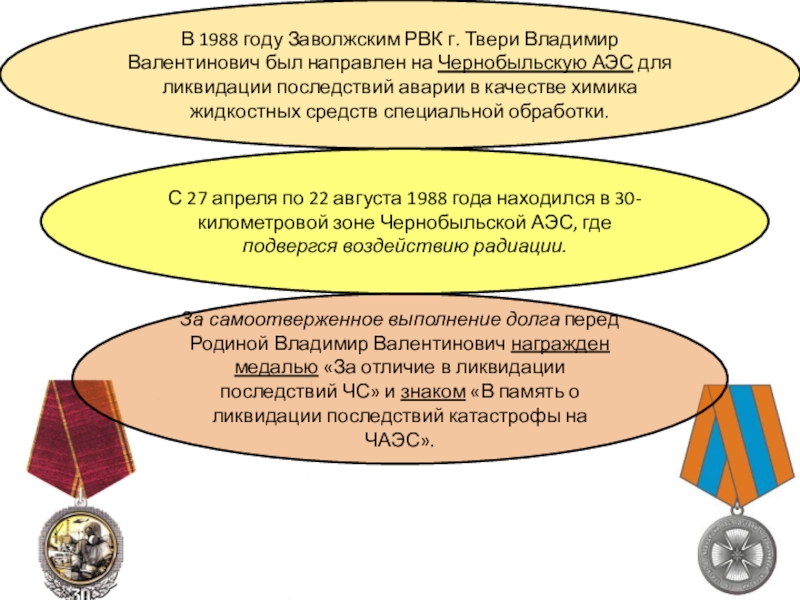 С 27 апреля по 22 августа 1988 года находился в 30-километровой зоне Чернобыльской АЭС, где подвергся воздействию радиации.