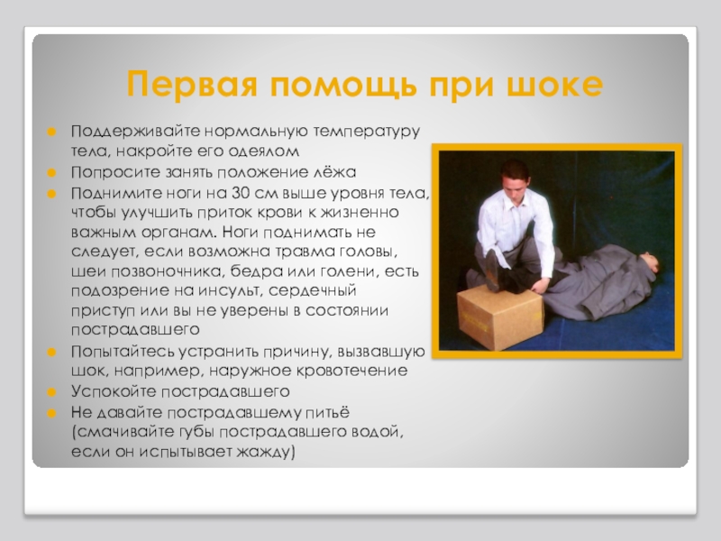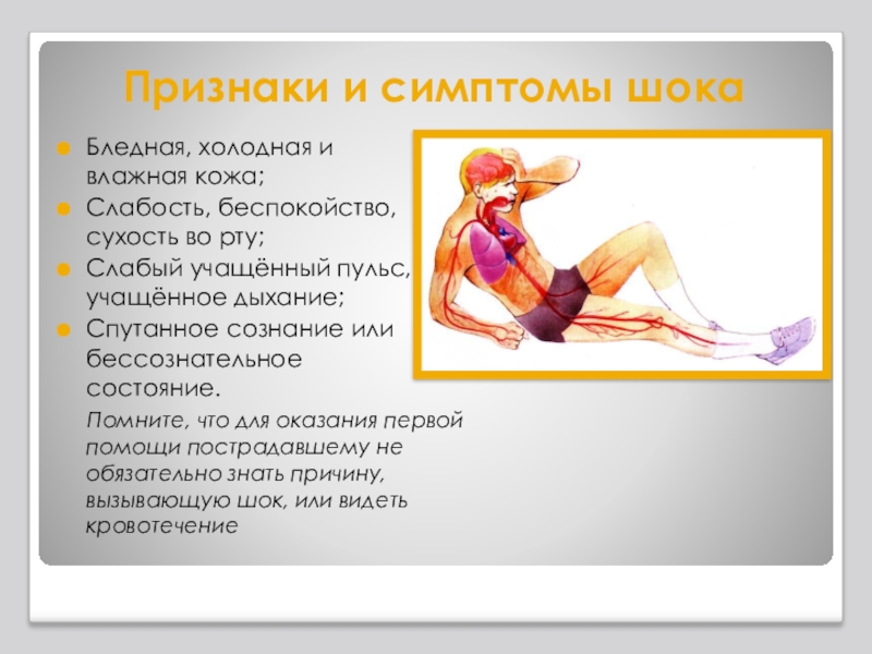 Помните, что для оказания первой помощи пострадавшему не обязательно знать причину, вызывающую шок, или видеть кровотечение