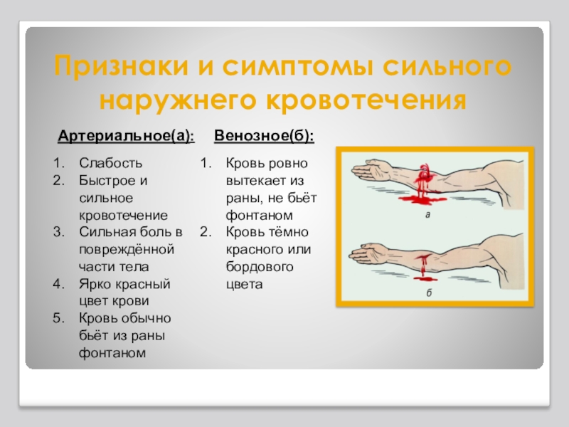 Слайд 8Признаки и симптомы сильного наружнего кровотечения