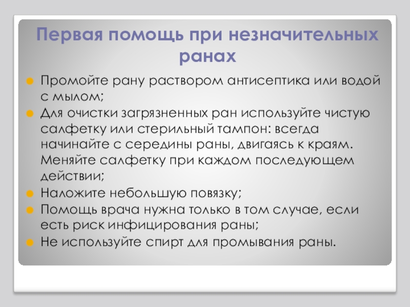 Для очистки загрязненных ран используйте чистую салфетку или стерильный тампон: всегда начинайте с середины раны, двигаясь к краям. Меняйте салфетку при каждом последующем действии;