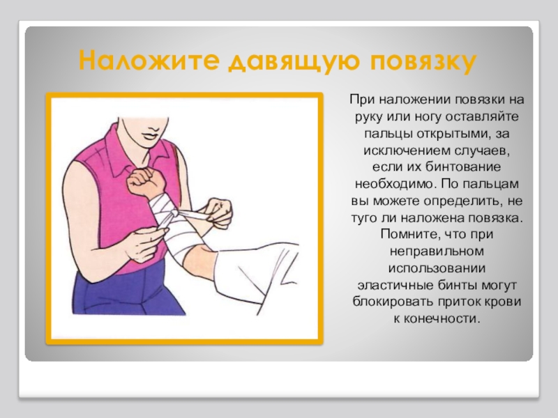 открытыми, за исключением случаев, если их бинтование необходимо. По пальцам вы можете определить, не туго ли наложена повязка. Помните, что при неправильном использовании эластичные бинты могут блокировать приток крови к конечности.