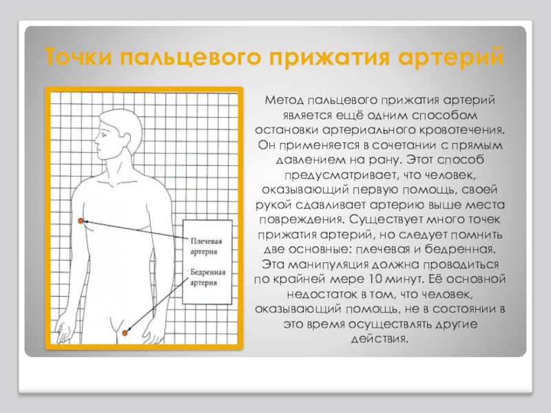 остановки артериального кровотечения. Он применяется в сочетании с прямым давлением на рану. Этот способ предусматривает, что человек, оказывающий первую помощь, своей рукой сдавливает артерию выше места повреждения. Существует много точек прижатия артерий, но следует помнить две основные: плечевая и бедренная. Эта манипуляция должна проводиться по крайней мере 10 минут. Её основной недостаток в том, что человек, оказывающий помощь, не в состоянии в это время осуществлять другие действия.