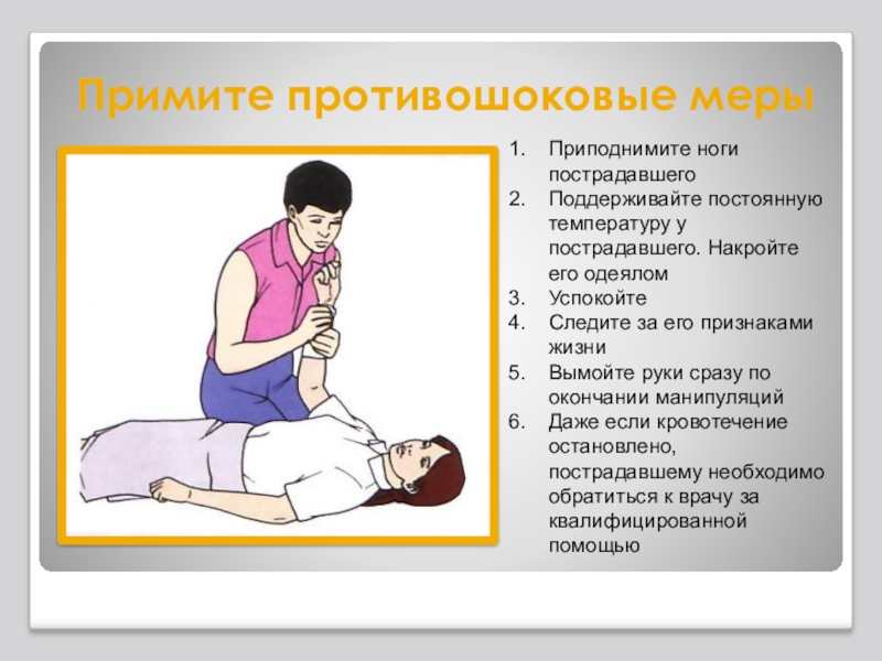 Попытайтесь устранить причину, вызвавшую шок, например, наружное кровотечение