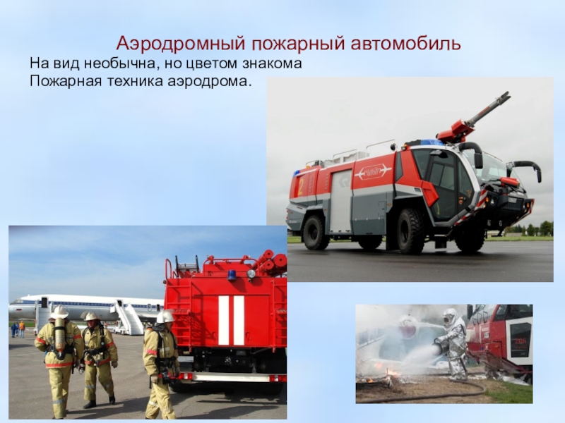 Аэродромный пожарный автомобильНа вид необычна, но цветом знакома Пожарная техника аэродрома.
