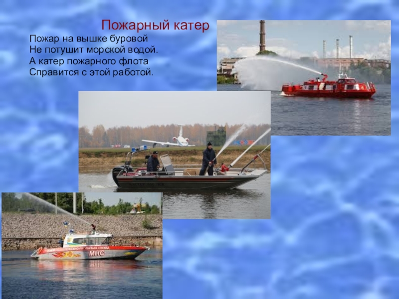 Пожарный катерПожар на вышке буровойНе потушит морской водой.А катер пожарного флотаСправится с этой работой.