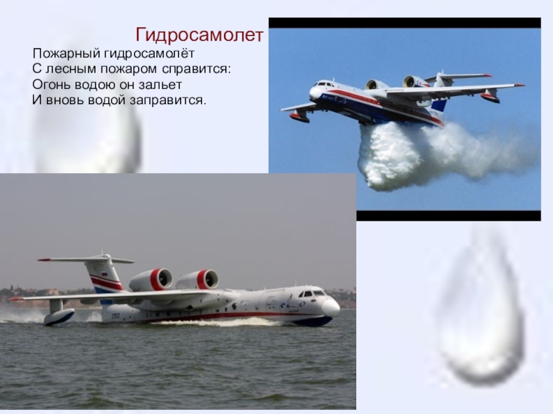 ГидросамолетПожарный гидросамолётС лесным пожаром справится:Огонь водою он зальетИ вновь водой заправится.