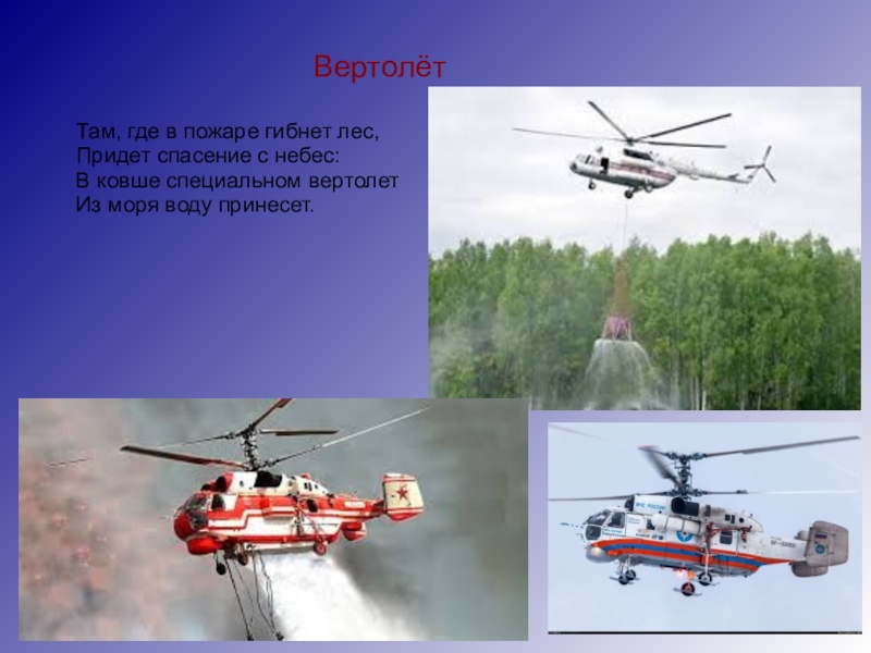 ВертолётТам, где в пожаре гибнет лес,Придет спасение с небес:В ковше специальном вертолетИз моря воду принесет.