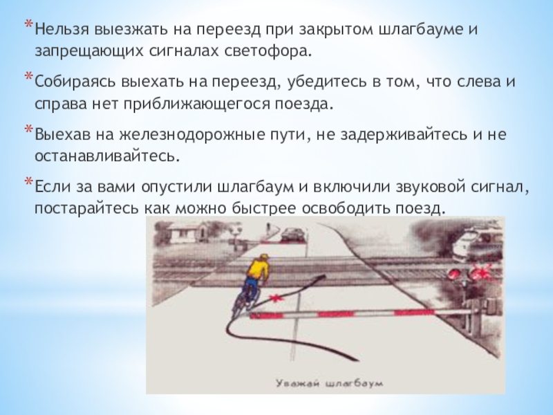 Слайд 6Нельзя выезжать на переезд при закрытом шлагбауме и запрещающих сигналах светофора.